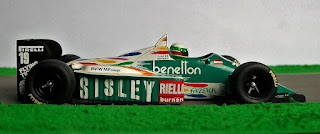 Esta hermosa miniatura de Minichamps que les presento hoy, muestra el multicolor B186 tal como fue usado a lo largo de todo el año. La pequeña banderita rojo y blanca a los costados del cockpit, nos indica que el auto número 19 manejado por Teo Fabi pertenece al GP de Austria.