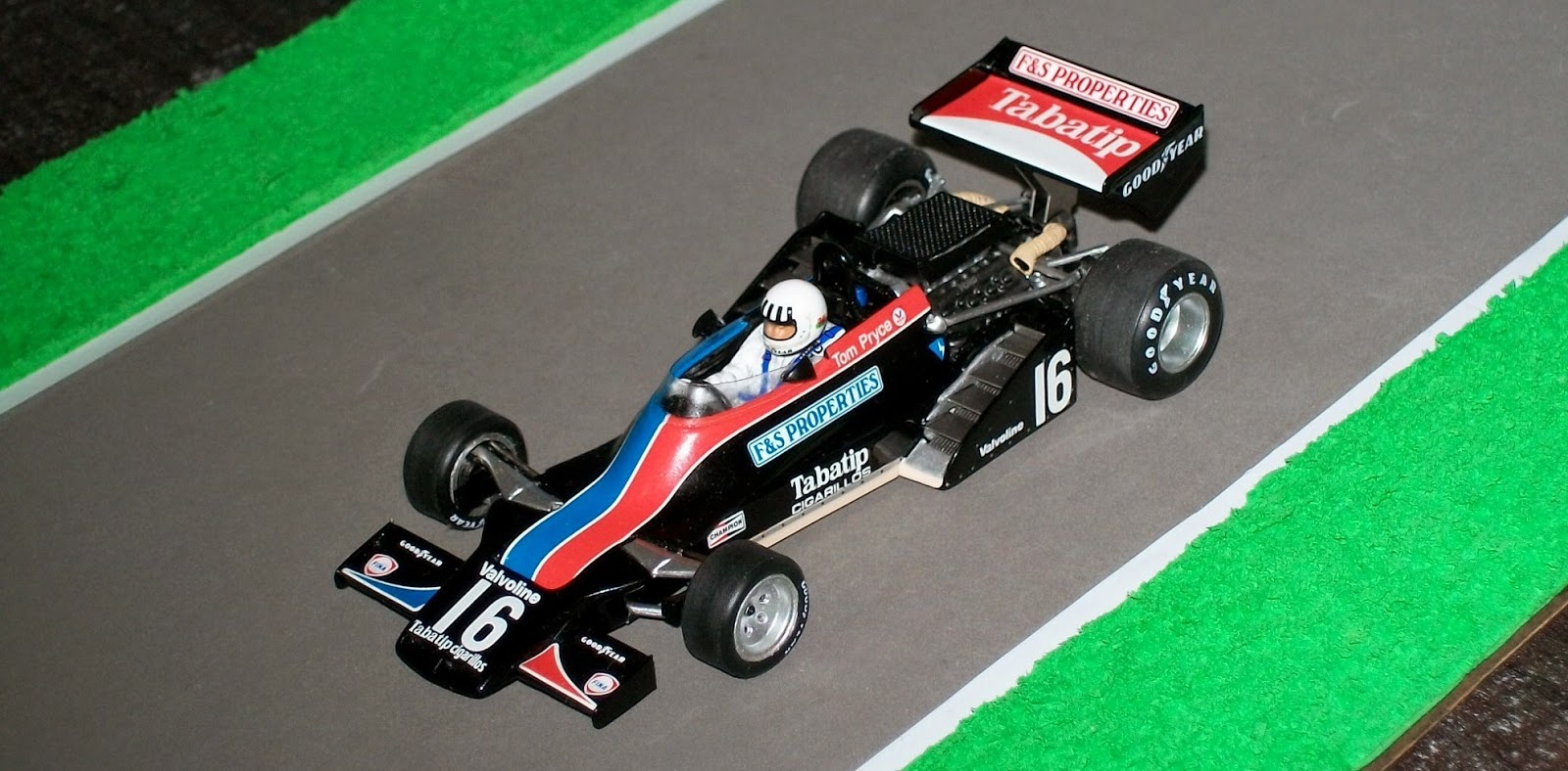 Y aquí va la miniatura: Shadow DN5 de Spark del galés Tom Pryce en el GP de Holanda de 1975. El DN5 es el modelo más recordado de Shadow, y el mejor de todos los que esta marca angloamericana presentó en sus ocho años de vida en la F1. Ya en sus dos primeros GP, Argentina y Brasil 1975, marcó la pole en manos del francés Jean Pierre Jarier: en Argentina rompió la caja antes de largar y en Brasil era cómodo puntero hasta que sufrió una rotura. Luego Pryce ganó la Carrera de Campeones en Inglaterra, sin puntos para el campeonato; en Mónaco los dos coches abandonaron luego de calificar en segundo y tercer lugar; Pryce hizo la pole en el GP de Gran Bretaña, carrera que ambos ambos pilotos lideraron antes de abandonar; Jarier era segundo en Suecia hasta que su motor se rompió, se ubicaba en el mismo puesto en Alemania antes de una fuga de combustible, lideraba en el GP de Suiza hasta una rotura de transmisión y estaba tercero en Watkins Glen cuando falló un cojinete de rueda. Shadow terminó el año 1975 con solo un tercer puesto (Pryce), dos cuartos (Jarier y Pryce) y tres sextos (todos de Pryce, uno en este GP de Holanda que representa la miniatura). Magros resultados para un coche que peleó la punta gran parte del año.