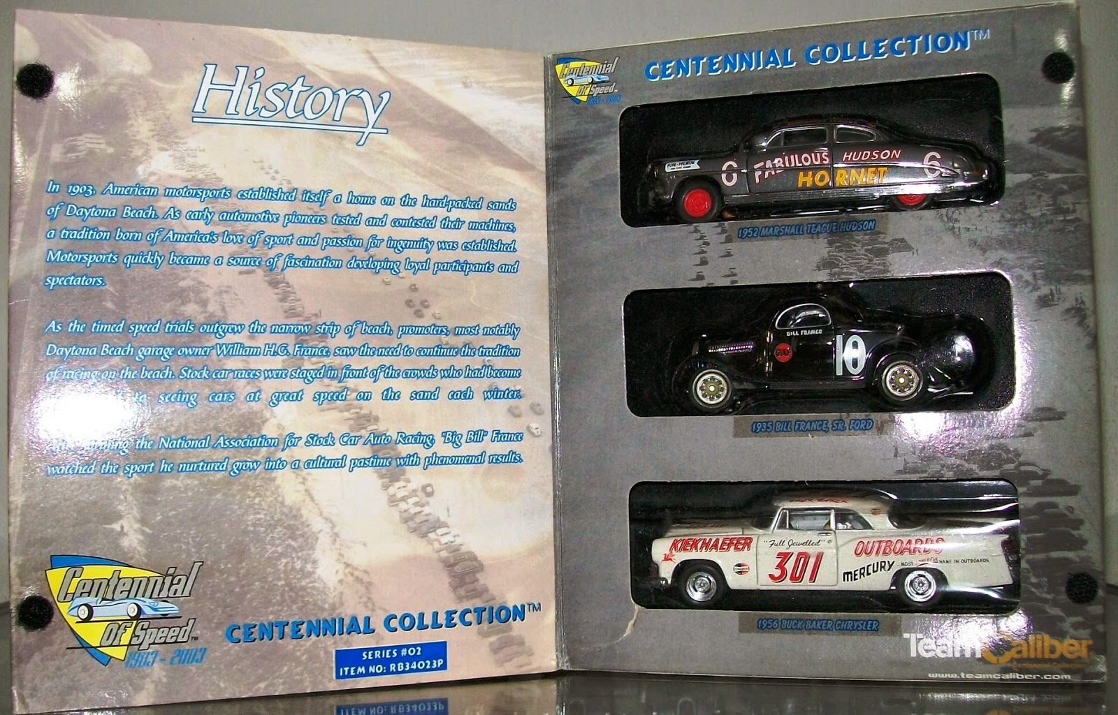 Hola amigos, hoy les presento un coche del stock car estadounidense, categoría precursora de la hoy famosa NASCAR. Este auto pertenece a Bill France, un piloto muy conocido por ser en la posguerra co-fundador de NASCAR. En los años treinta, el circuito playero de Daytona Beach en Florida era muy popular debido a los intentos de records de velocidad que en él se llevaban a cabo. Pero en esos años, Malcolm Campbell y otros habituales pilotos decidieron dejar de competir en las playas de Daytona, y trasladarse el salar de Bonneville, ya que la pista de Florida estaba demasiada llena de baches. Funcionarios de la ciudad de Daytona, decididos a mantener los eventos relacionados con la velocidad (que habían sido una fuente de ingresos para los hoteles y restaurantes de la zona), buscan organizar otro tipo de carreras en las playas. El 8 de marzo de 1936 se corre la primer carrera de autos stock en el circuito de Daytona Beach; dicha carrera, organizada por la American Automobile Association (AAA...), fue a 78 vueltas para sedanes familiares construidos en 1935 y 1936. Ese día se dieron cita miles de fans en la pista sobre la playa; las dos curvas que unían las dos largas rectas del circuito, llenas de arena, se terminaron convirtieron en intransitables para muchos autos; igualmente Bill France logró terminar en quinto lugar. El coche que utilizó en esa carrera es el que les presento hoy. Se trata de una muy bella (y pesada) miniatura de Team Caliber (marca por mi desconocida, con oficinas en Carolina del Norte pero modelos fabricados en, por supuesto, China), con muchas aperturas y detalles, que viene en un hermoso estuche junto a sus dos acompañantes, también coches tipo stock car de los utilizados por el NASCAR, que les presentaré en las próximas semanas.
